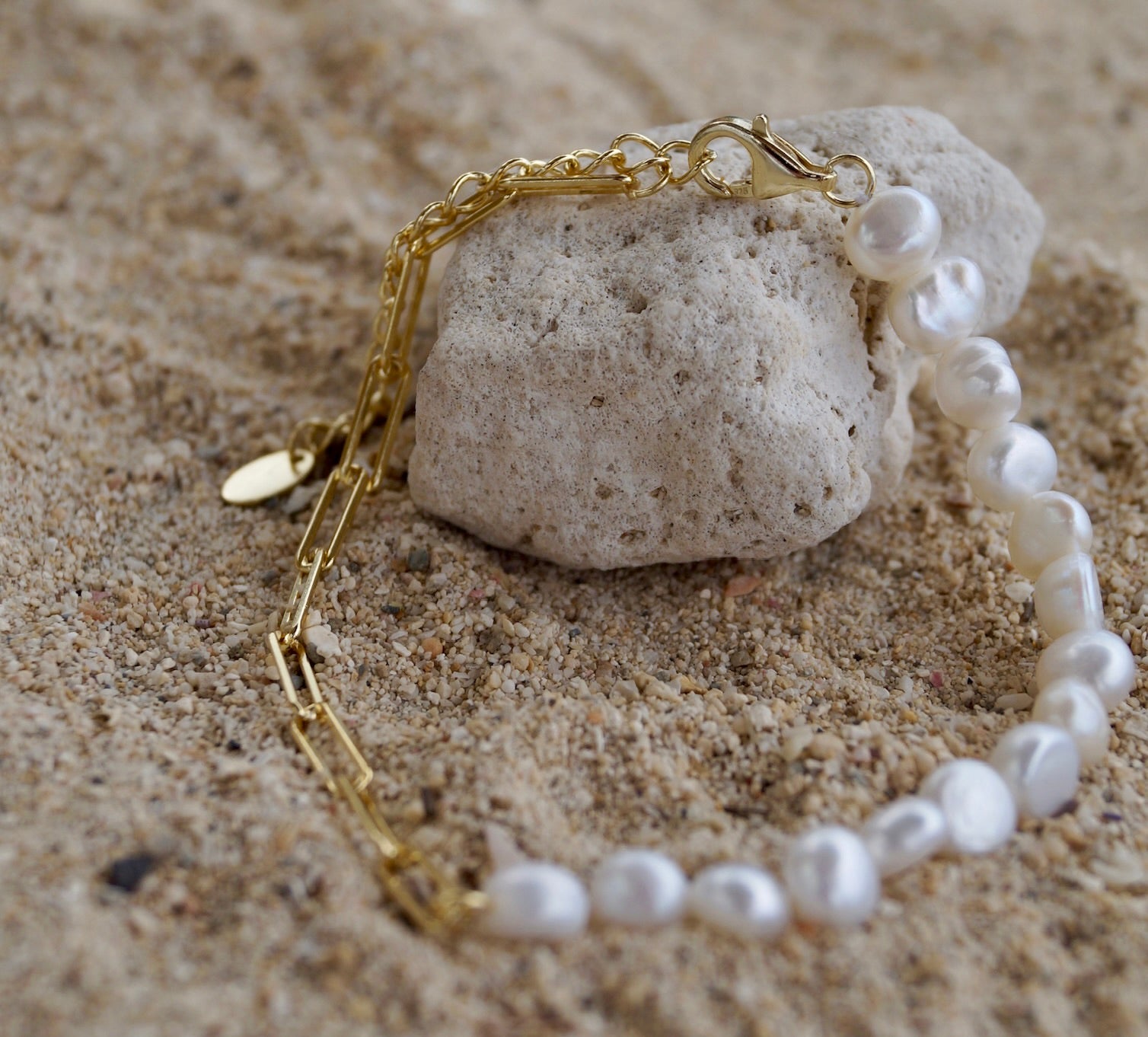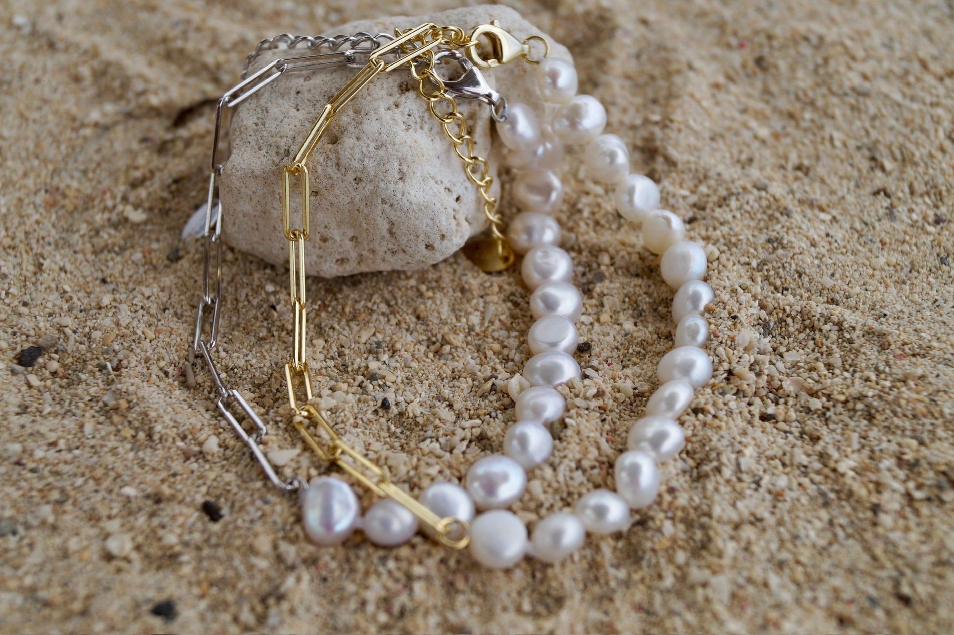 Dieses Armband vereint zwei klassische Schmuckstile in einem: Eine Hälfte besteht aus schimmernden Perlen, die andere aus einer feinen Gliederkette in edler Gold- oder Silberoptik. Das Ergebnis ist ein moderner, eleganter Look, der sowohl solo als auch im Stack getragen ein echter Hingucker ist.