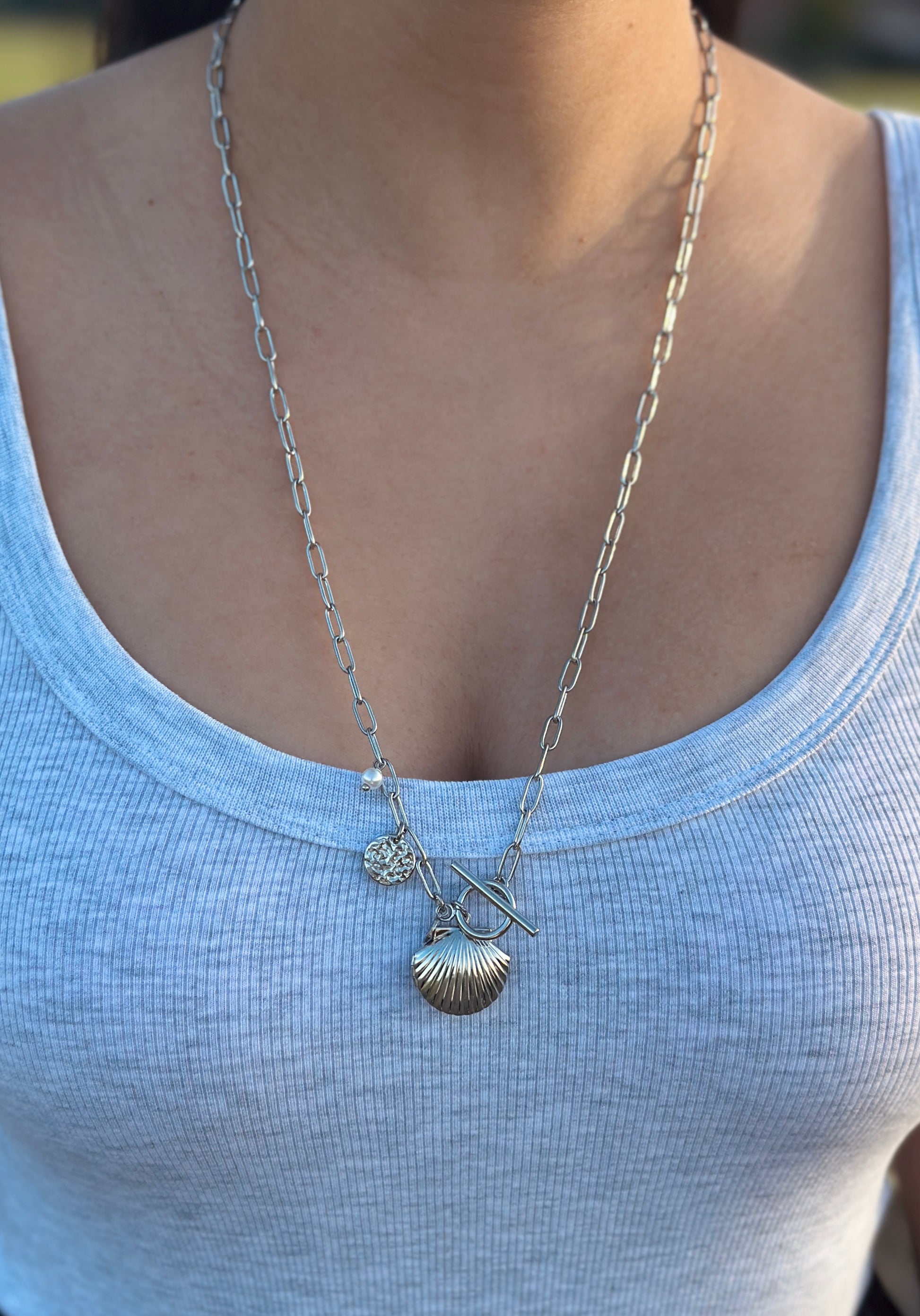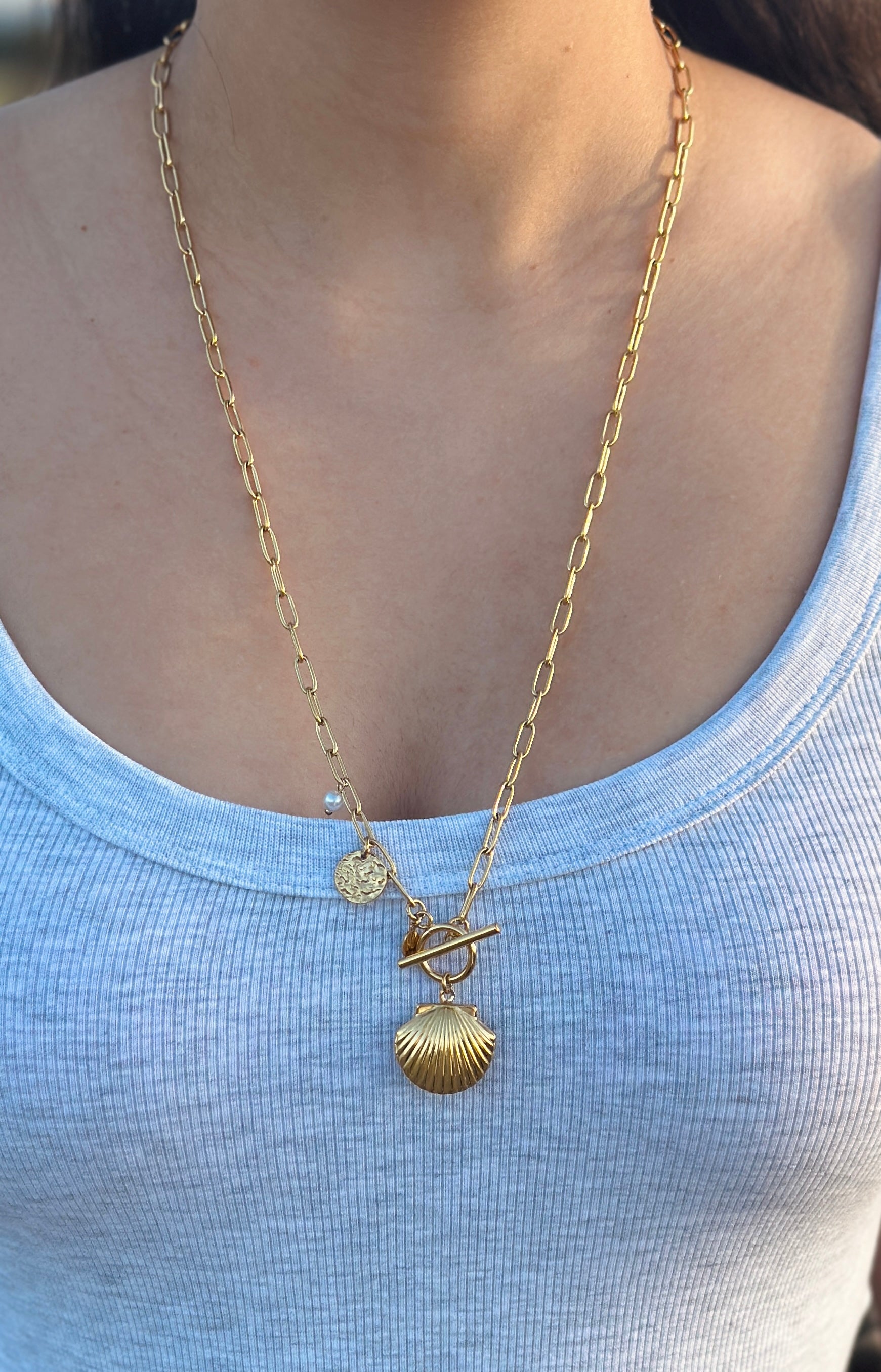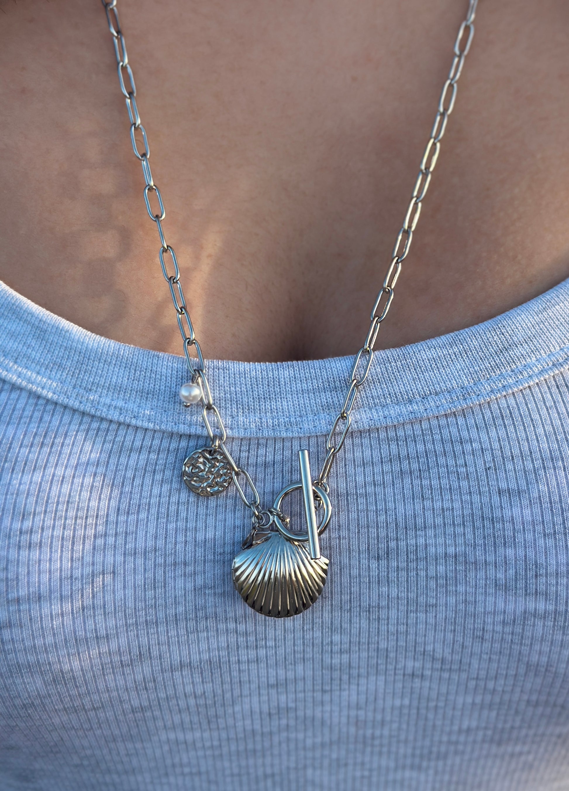 Stilvolle Kette mit markanter Gliederstruktur, verziert mit Muschel-, Münz- und Perlenanhänger. Der T-Verschluss rundet das Design ab. In Silber oder Gold Optik erhältlich.