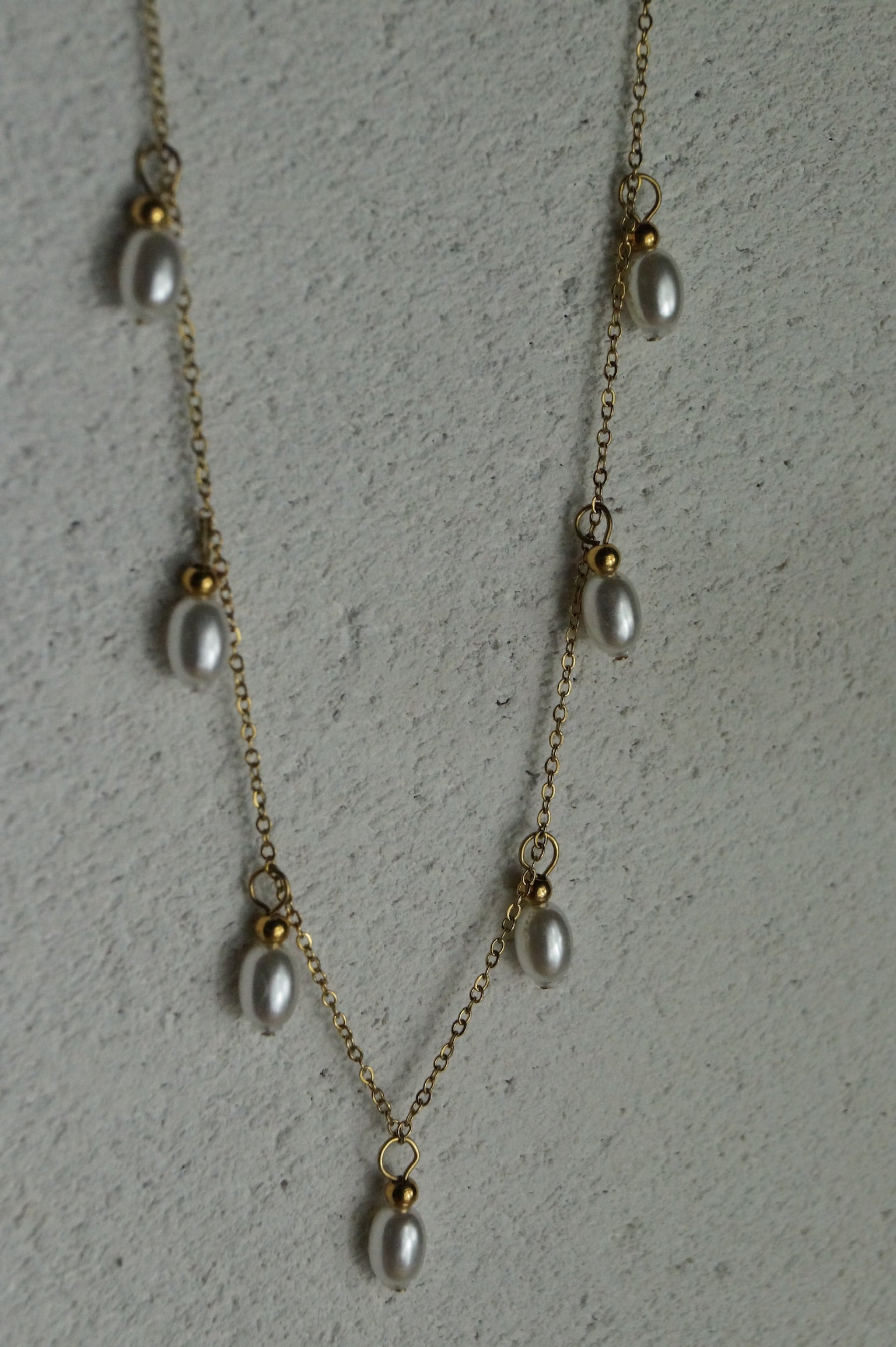 Diese filigrane Kette vereint zeitlose Eleganz mit einem modernen, leichten Look. Mehrere kleine Perlenanhänger verleihen dem Schmuckstück einen edlen Schimmer und machen es zu einem stilvollen Begleiter für Alltag und besondere Anlässe.